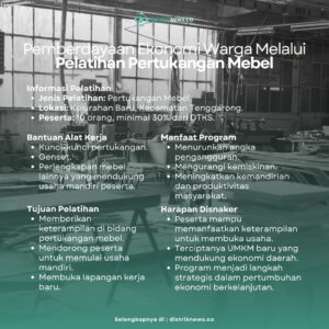 Distriknews.co, Kutai Kartanegara – Dalam rangka meningkatkan kemandirian ekonomi masyarakat, Dinas Tenaga Kerja dan Transmigrasi (Disnaker) Kukar menggelar pelatihan pertukangan mebel selama lima hari di Kelurahan Baru, Kecamatan Tenggarong. Sebanyak 10 peserta, sebagian besar dari Kelurahan Baru dan termasuk dalam Data Terpadu Kesejahteraan Sosial (DTKS), mengikuti program ini dengan antusias.