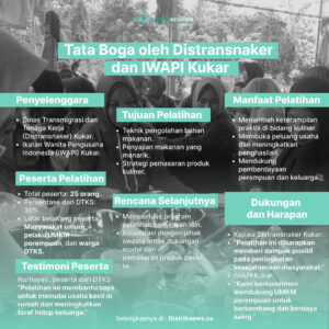 Distriknews.co, Kutai Kartanegara – Dalam upaya meningkatkan keterampilan masyarakat, Dinas Transmigrasi dan Tenaga Kerja (Distransnaker) Kutai Kartanegara bekerja sama dengan Ikatan Wanita Pengusaha Indonesia (IWAPI) Kukar mengadakan pelatihan tata boga yang bertujuan membuka peluang usaha baru di sektor kuliner. Pelatihan ini melibatkan peserta dari berbagai latar belakang, dengan 30% di antaranya berasal dari Data Terpadu Kesejahteraan Sosial (DTKS).