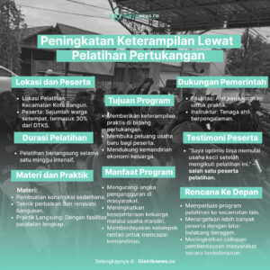 Pelatihan yang berlangsung selama satu minggu ini mencakup teori dan praktik langsung di bidang pertukangan, seperti pembuatan konstruksi sederhana dan perbaikan bangunan. Peserta juga didukung dengan fasilitas peralatan lengkap yang memungkinkan mereka langsung mengaplikasikan ilmu yang diperoleh selama pelatihan.