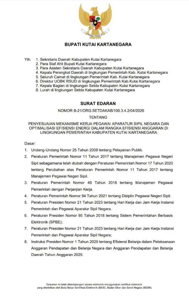 DISTRIKNEWS.CO – Pemerintah Kabupaten Kutai Kartanegara resmi menerapkan kebijakan Work From Home (WFH) bagi aparatur sipil negara (ASN) sebagai bagian dari penyesuaian sistem kerja yang