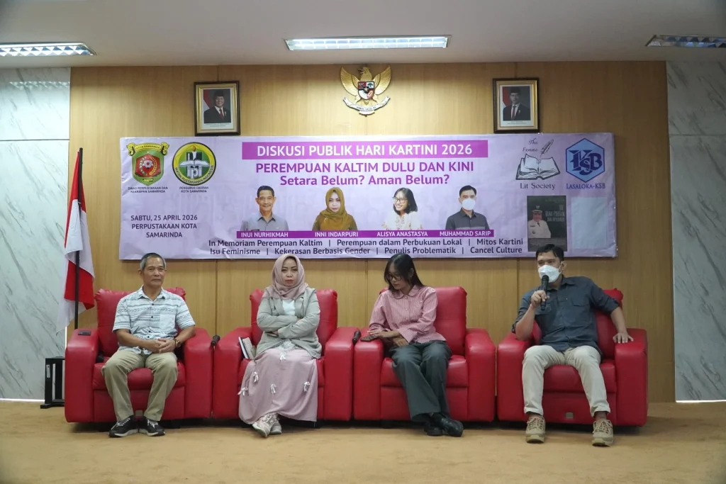 Even Empat Narasumber Sekaligus Host Warnai Diskusi Publik Perempuan Kaltim Dulu dan Kini redaksi Sabtu, 25 April 2026 Inui Nurhikmah, Inni Indarpuri, Alisya Anastasya, Muhammad Sarip dalam Diskusi Publik Hari Kartini di Perpustakaan Kota Samarinda (25/4/2026).